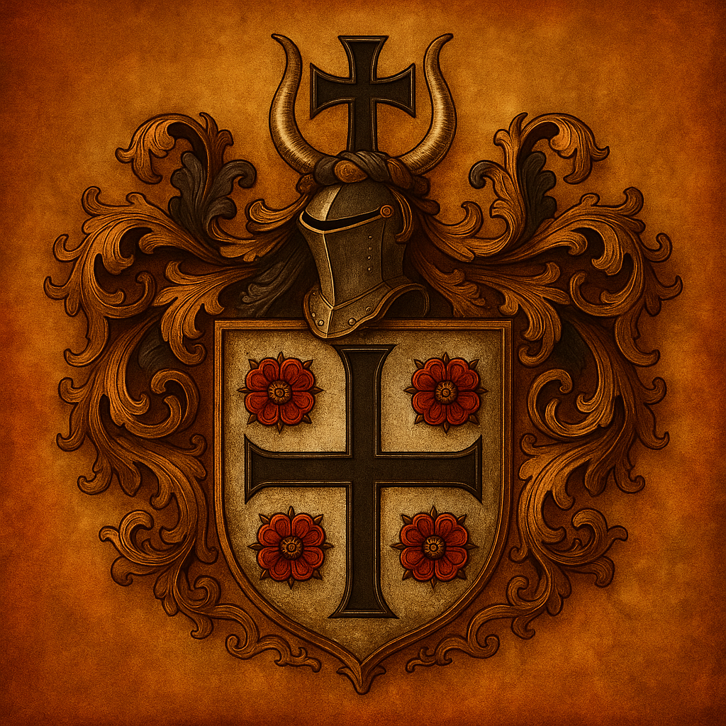 Das Wappen der Familie zeigt in Silber ein schwarzes Tatzenkreuz, begleitet von vier roten Rosen in den Winkeln. Der schwarze Kreuzbalken symbolisiert Ritterehre, christliche Standhaftigkeit und Wehrhaftigkeit, während die Rosen für Treue und Beständigkeit stehen. Auf dem Helm thront ein schwarzes Kreuz zwischen zwei silbernen Büffelhörnern.